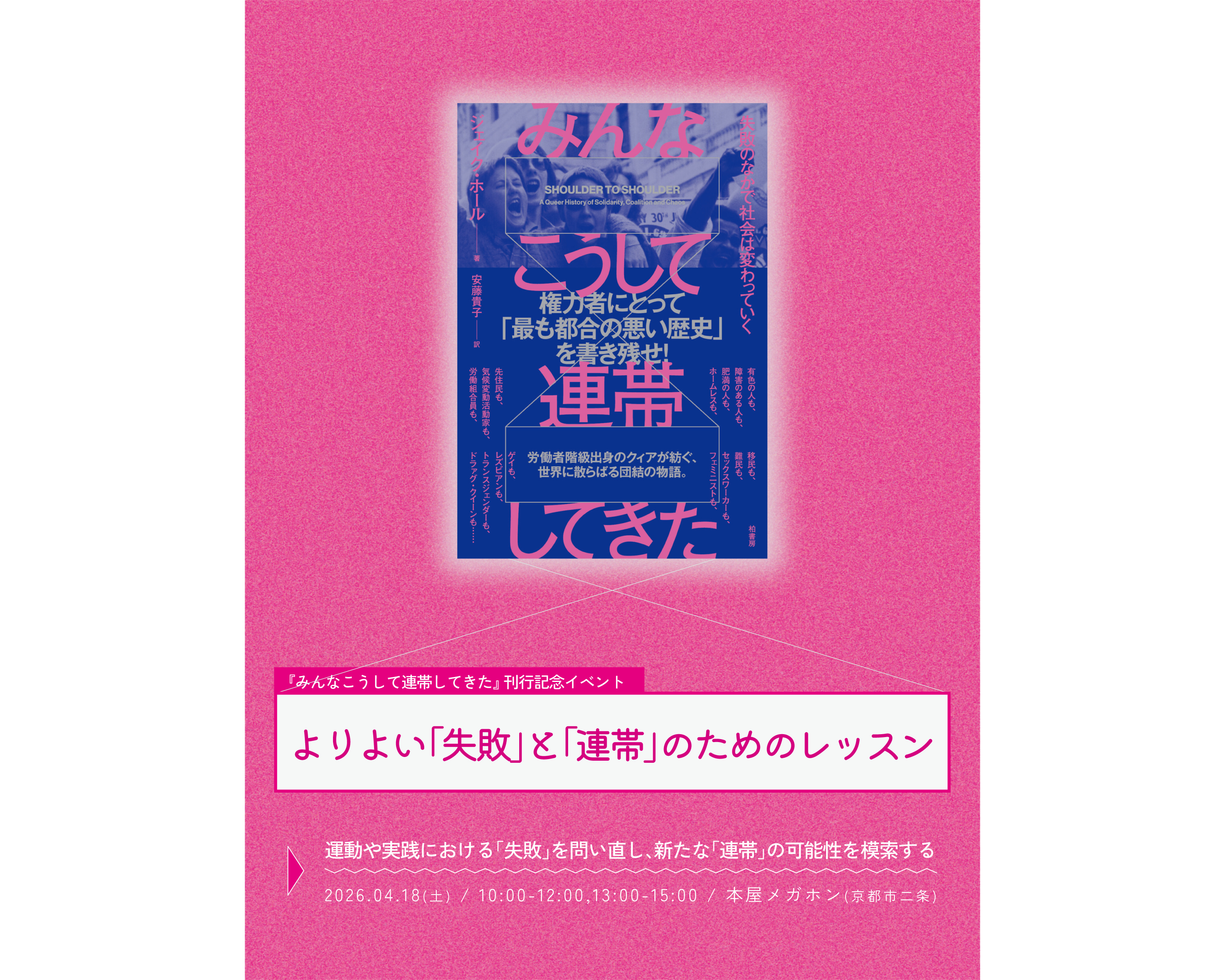 『みんなこうして連帯してきた』(柏書房)の刊行に合わせたワークショップイベント「よりよい「失敗」と「連帯」のためのレッスン」を開催します。運動や実践における「失敗」にまつわる規範を問い直し、分断や排除が進む社会におけるよりよい連帯のあり方を模索することを目的としたイベントです。未読/未購入でも参加可能ですので、ぜひお気軽にお申込ください!